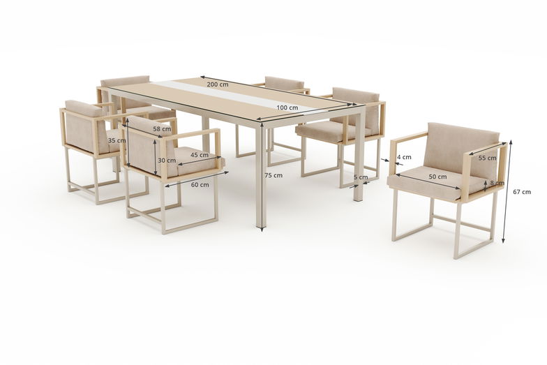 SKU 36167 Kissen & Auflagen hoher Sitzkomfort, 8 cm dicke Polsterauflage, Schaumstoff Eigenschaften pflegeleicht Material Aluminium Tischplatte Keramik auf Glas, Aluminium, Beige, Naturholz-Optik, Stärke 8 mm Lieferumfang 1x Esstisch, 6x Stuhl, Sitzauflagen inklusive Sitzplätze bis zu 6 Gestell Aluminium, pulverbeschichtet Light Champagne, Aluminium, pulverbeschichtet, robust, rostfrei, wetterbeständig Art Essgruppen Bezug 100% Polyester, Beige , schnell trocknend, abnehmbar, waschbar bei 30°C, robuste Verarbeitung, edle Kedernaht, hohe Festigkeit, hochwertige Kunstfaser, vorimprägniert, verdeckte Reißverschlüsse Gewicht ca. 90 kg Sicherheitshinweise