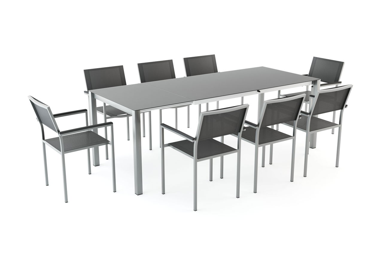 Ergänzt wird das Ensemble durch den ausziehbaren Tisch, der mit seinem hochwertigen Edelstahlgestell und der eleganten dunklen Glasplatte einen Hauch von Raffinesse in Ihren Außenbereich bringt. Seine Größe ist anpassbar, von 160 cm auf 220 cm ausziehbar, was Ihnen Flexibilität für unterschiedliche Anlässe bietet und gleichzeitig die perfekte Bühne für Ihre kulinarischen Erlebnisse im Freien darstellt.