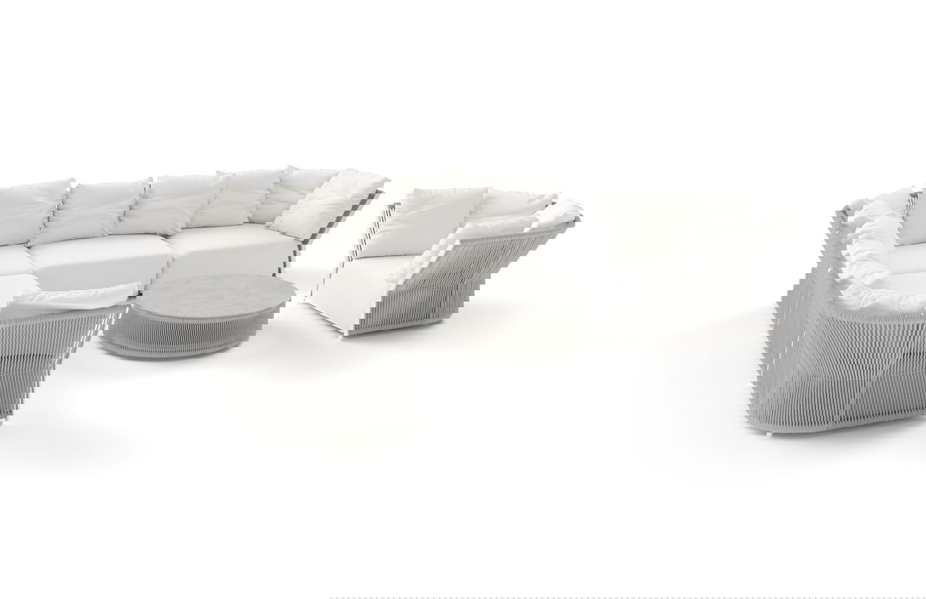 Die Khora Lounge Plus besticht durch ein modernes und zugleich zeitloses Design. Das Gestell aus pulverbeschichtetem Aluminium in elegantem Weiß sorgt für eine langlebige, witterungsbeständige Basis, während die fein gearbeitete Rope-Bespannung in Hellgrau den Elementen eine außergewöhnliche Leichtigkeit verleiht. Dieses luftige Detail an Arm- und Rückenlehnen unterstreicht die Exklusivität und zieht garantiert alle Blicke auf sich.