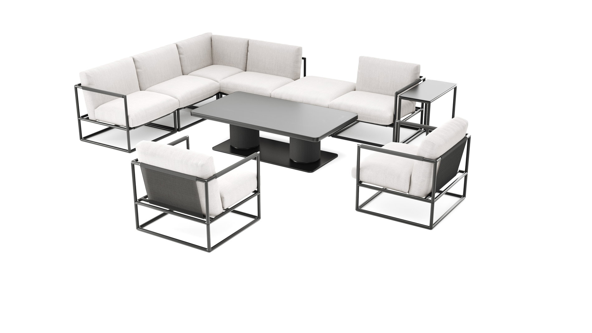 Das Ensemble bietet Platz für bis zu 8 Personen und umfasst Hocker, Sessel, Mittel- und Ecksofas sowie Abschlusssofas und Beistelltische. Jedes Element ist präzise aufeinander abgestimmt und schafft eine harmonische, einladende Lounge, die den Komfort eines Luxus-Hotels in den eigenen Garten transportiert.