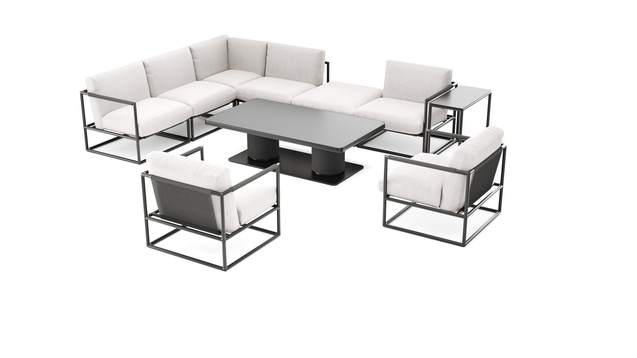 Die Verso Lounge Max entfaltet eine grafische, architektonische Designsprache in einer klar geordneten Komposition. Das anthrazitfarbene Aluminiumgestell bildet weit auslaufende, geometrische Rahmen, deren Kuben-Ästhetik ein strukturiertes Gesamtbild erzeugt. Die klare Linienführung wirkt modern und bewusst reduziert und verleiht dem Ensemble eine souveräne, ruhige Präsenz im Außenbereich – wie eine stilvolle Lounge aus einem Luxus-Hotel im eigenen Garten.