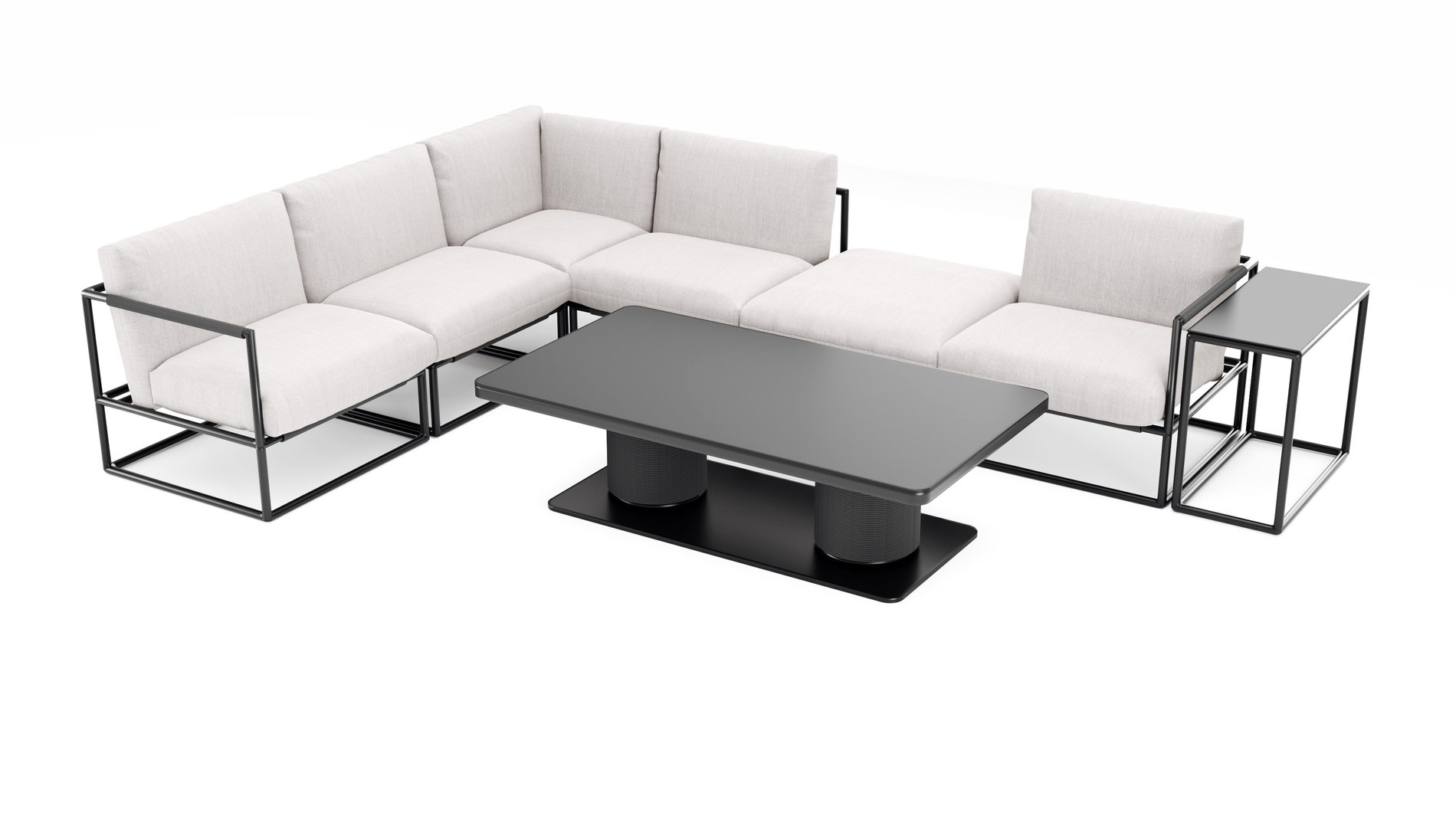 Die Verso Lounge verkörpert ein geometrisches, strukturiertes Outdoor-Design, das durch seine präzise Kuben-Ästhetik unmittelbar wirkt. Das anthrazitfarbene Aluminiumgestell zeichnet geradlinige, grafische Rahmen, deren ruhige Ordnung und klare Konturen eine moderne, zurückhaltende Eleganz erzeugen. Die offene Konstruktion vermittelt visuelle Leichtigkeit und fügt sich selbstverständlich in verschiedenste Außenbereiche ein – wie ein stilvolles Lounge-Ensemble eines Luxus-Hotels im eigenen Garten.