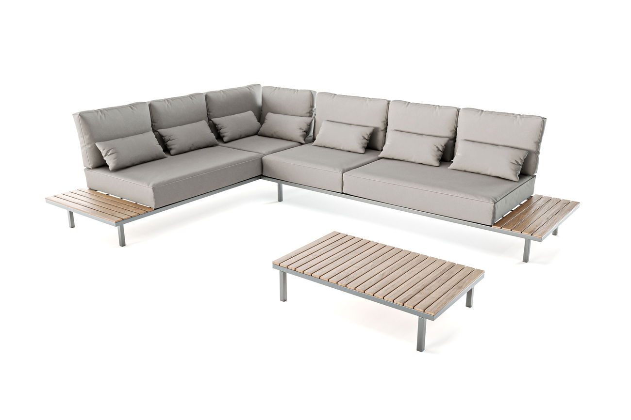 Die gesamten 3-Sitzer sind mit einem robusten Edelstahlgestell versehen, das Langlebigkeit und Stabilität gewährleistet. Am Fußende jedes 3-Sitzers befindet sich eine großzügige Ablagefläche, die mit eleganten Teakholzlatten versehen ist. Diese bieten nicht nur einen praktischen Raum für Ihre Getränke, Snacks oder Ihre Lieblingslektüre, sondern verleihen dem Set auch eine natürliche Ästhetik und Wärme. Der dazu passende Tisch mit einer Gestell- und Tischplatte aus Edelstahl und Teakholz vervollständigt das Ensemble und bietet einen stilvollen Mittelpunkt für gesellige Zusammenkünfte im Freien.