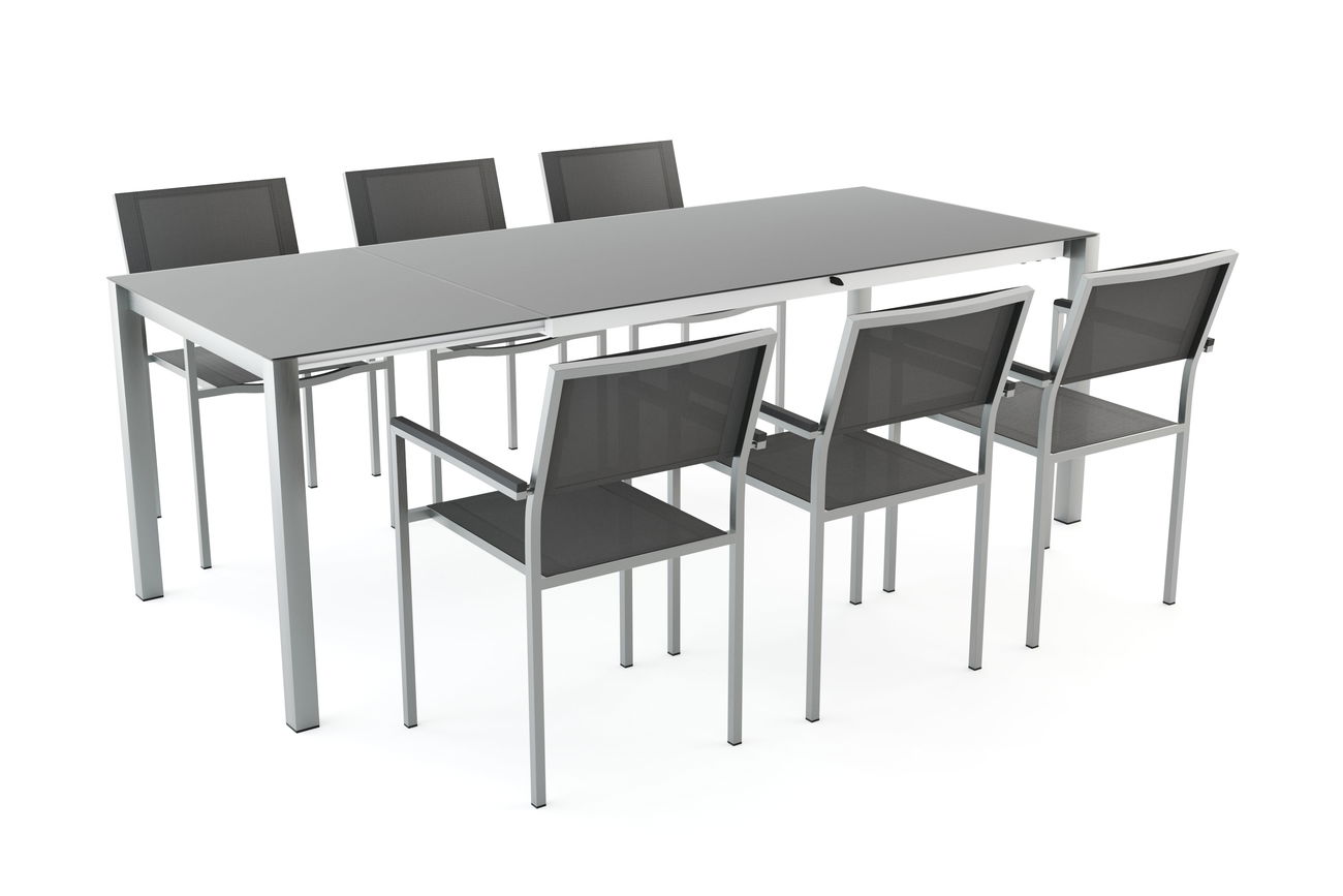 Ergänzt wird das Ensemble durch den ausziehbaren Tisch, der mit seinem hochwertigen Edelstahlgestell und der eleganten dunklen Glasplatte einen Hauch von Raffinesse in Ihren Außenbereich bringt. Seine Größe ist anpassbar, von 160 cm auf 220 cm ausziehbar, was Ihnen Flexibilität für unterschiedliche Anlässe bietet und gleichzeitig die perfekte Bühne für Ihre kulinarischen Erlebnisse im Freien darstellt.