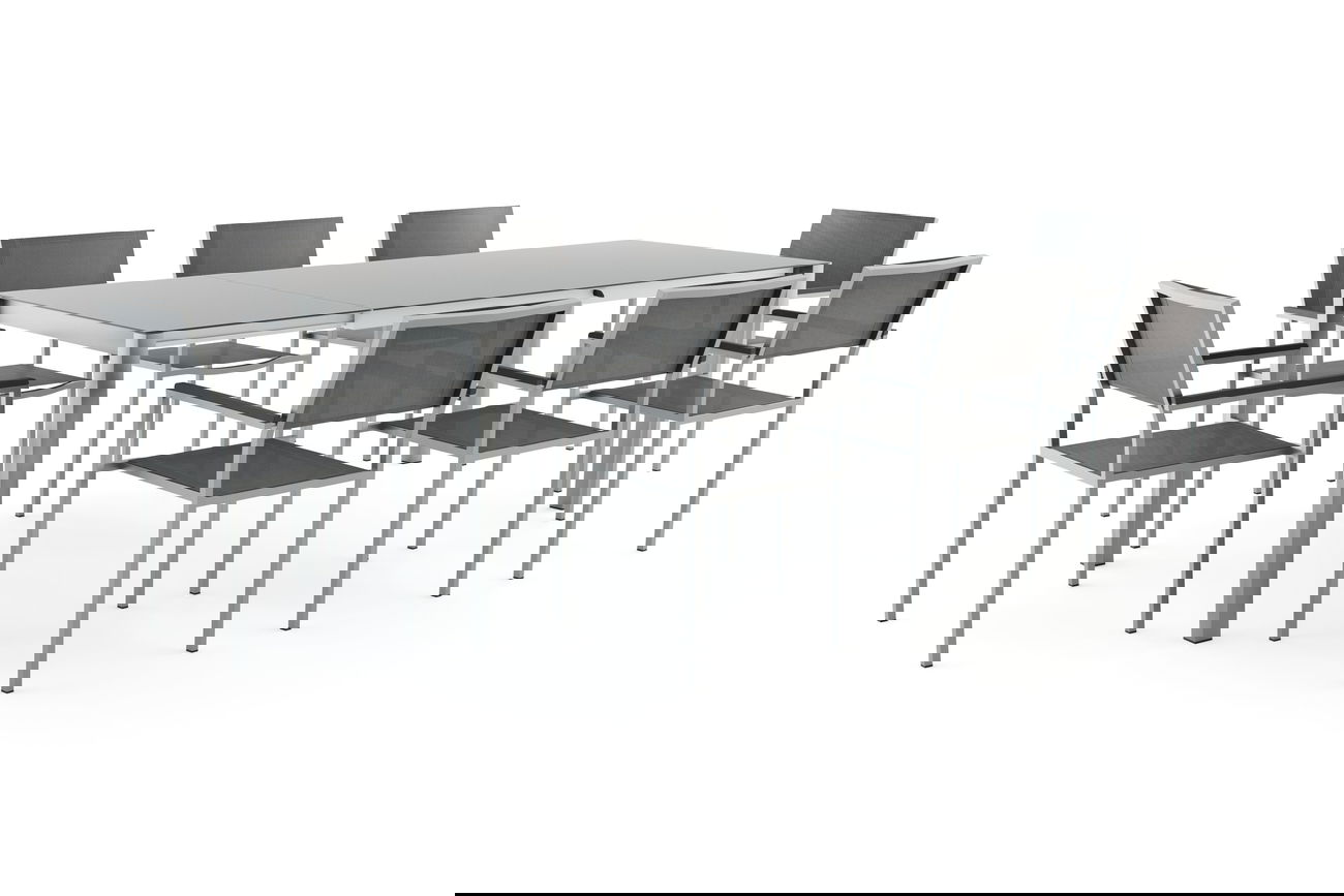 Ergänzt wird das Ensemble durch den ausziehbaren Tisch, der mit seinem hochwertigen Edelstahlgestell und der eleganten dunklen Glasplatte einen Hauch von Raffinesse in Ihren Außenbereich bringt. Seine Größe ist anpassbar, von 160 cm auf 220 cm ausziehbar, was Ihnen Flexibilität für unterschiedliche Anlässe bietet und gleichzeitig die perfekte Bühne für Ihre kulinarischen Erlebnisse im Freien darstellt.