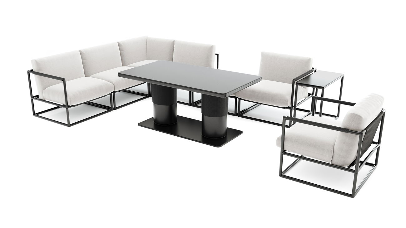 Der höhenverstellbare Tisch mit seiner dunklen, kratzfesten Milchglasoberfläche verbindet Funktionalität mit architektonischer Klarheit. Unter der Tischplatte sorgt eine diskret integrierte Beleuchtung bei einsetzender Dämmerung für ein warmes, ruhiges Licht, das die Tischarchitektur sanft hervorhebt und eine angenehme Abendstimmung schafft. Die verstellbare Höhe erweitert die Einsatzmöglichkeiten, ohne die ruhige, grafische Wirkung zu beeinträchtigen. So entsteht ein monochromes, präzise abgestimmtes Outdoor-Ensemble, welches sich geschmackvoll in jeden modernen Außenbereich einfügt.